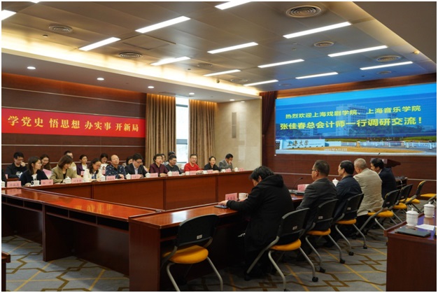 参观结束后,一行人共赴上海大学乐乎新楼开展工作调研学习。调研会上,上海戏剧学院党委常委、上戏上音总会计师张佳春介绍了此次调研的目的与内容,并介绍了上戏、上音的财务管理及内控建设情况。上海大学财务处处长、国有资产管理办公室主任褚贵忠代表苟燕楠总会计师对调研团一行表示热烈欢迎,并从预算管理、资产管理、财务管理三方面进行了交流,着重介绍了上海大学围绕高水平大学的建设目标,按照“保育人、保民生、保基本、聚焦重点”的预算编制理念、校院二级负责人经济责任制的管理机制,以及国有资产管理改革等工作。随后,上海大学审计处处长尹应凯介绍了学校“内控为本、绩效为道”的内控体系建设情况,并就二级单位内控体系建设进行了交流;上海大学房屋资产管理处处长刘劲松介绍了学校房产管理工作,就教学科研超定额用房有偿使用作了深入交流;上海大学采购与招标管理办公室主任王林军对学校采购管理制度体系及信息化建设进行了介绍,并就采购内控管理、专家库、供应商库等方面作了交流。上海戏剧学院、上海音乐学院相关部门负责人也就本校的情况和工作中遇到的困难与上海大学的老师们展开了互动交流。