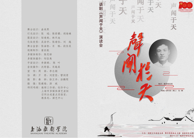 2021年6月15日,由上海戏剧学院戏剧文学系党支部、舞台美术系党支部、表演系党支部联合编剧学研究中心共同为庆祝建党百年打造的原创话剧《声闻于天》演读会在新空间剧场成功上演,此次演读会也是面向三个支部党员教师的主题党日活动。校党委副书记胡敏,党委副书记、副院长张伟令,副院长杨扬,总会计师张佳春,资深学者专家叶长海、胡雪桦、孙惠柱等受邀出席。