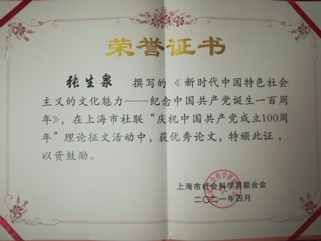 由我校党委宣传部原部长、上海市教委特聘教师人文修养培养专家张生泉教授撰写的《新时代中国特色社会主义的文化魅力》在中共上海市委宣传部统一部署、市社联精心组织的上海市庆祝中国共产党成立100周年理论征文中获优秀论文奖。
