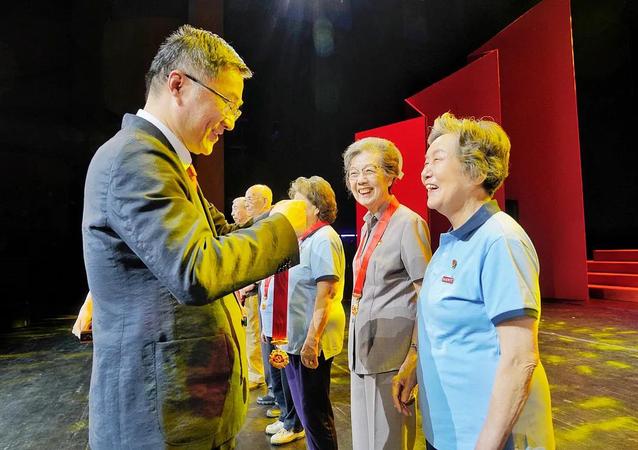 当校领导为老党员们逐一戴上纪念章时,全场爆发出热烈的掌声,大家由衷地向这群为上戏建设与发展奉献毕生精力的老领导、老专家、老同志送上敬意与祝福。青年学生代表为老党员们献上了鲜花。