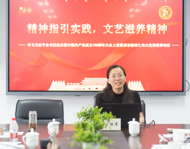 校组织部部长兼人事处处长、教师工作部部长陈云以“精神指引实践,文艺滋养精神”为题,聚焦伟大建党精神,分享了学习习近平总书记在庆祝中国共产党成立100周年大会上重要讲话精神的心得体会。她分别从思想理论、宗旨实践、精神品格、具体要求四个层面对“坚持真理、坚守理想、践行初心、担当使命、不怕牺牲、英勇斗争、对党忠诚、不负人民”的内涵要义进行了阐释分析。