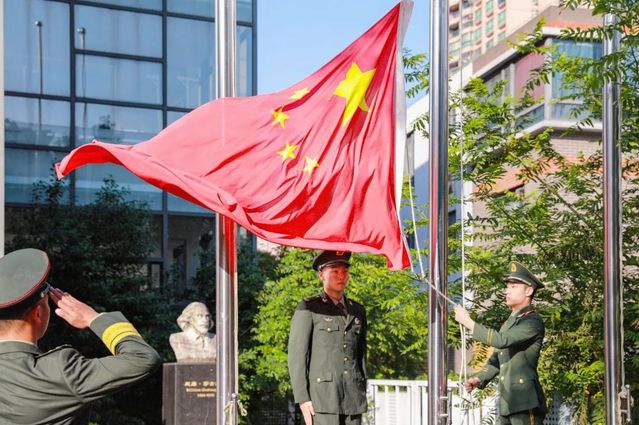 当鲜艳的五星红旗随着《义勇军进行曲》的雄壮旋律冉冉升起,全场师生高唱国歌,神情庄严肃穆,向飘扬的五星红旗行注目礼。