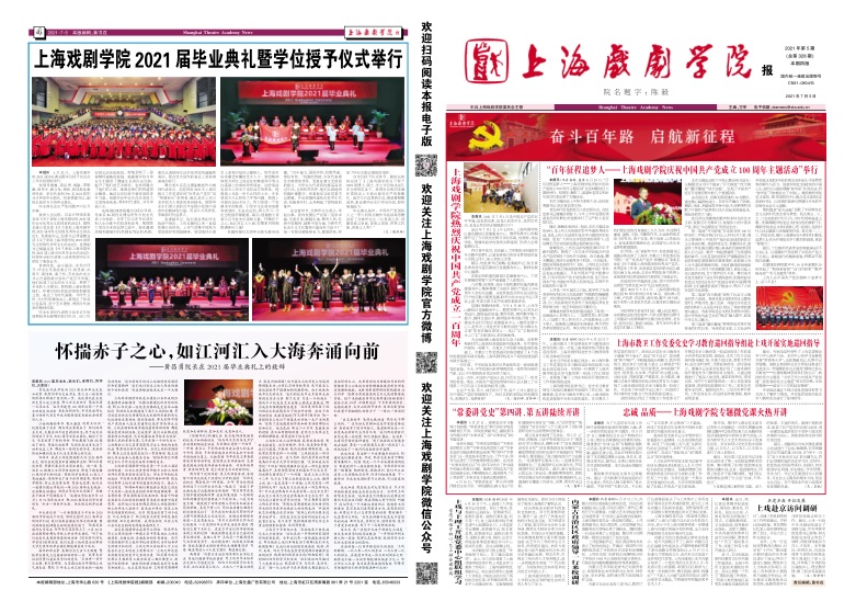 《上海戏剧学院报》2021年第5期(总第328期)已于2021年7月5日出版。重点内容有:《上海戏剧学院热烈庆祝中国共产党成立一百周年》《“百年征程追梦人——上海戏剧学院庆祝中国共产党成立100周年主题活动”举行》《上海市教卫工作党委党史学习教育巡回指导组赴上戏开展实地巡回指导》《“常委讲党史”第四讲、第五讲陆续开讲》等。敬请关注,也可点击下载阅读。(文、图、编辑:榕树)