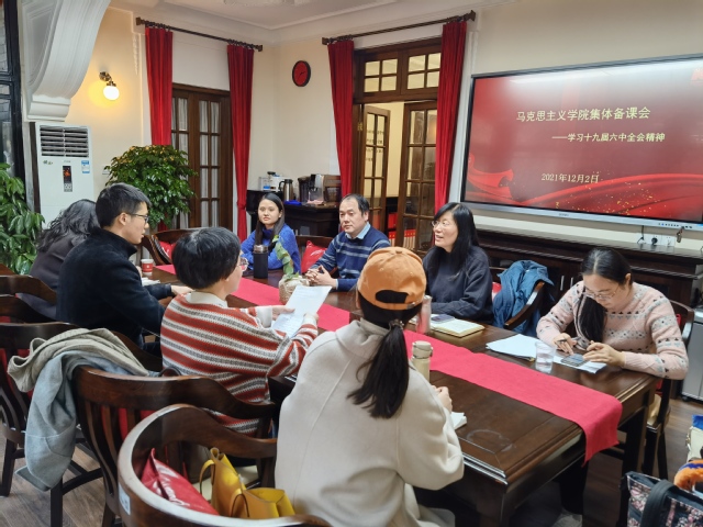 整场备课会紧密贴合时政,以“学习十九届六中全会精神”为主题进行研讨,并结合今年新修订的2021版思想政治理论课教材进行交流。会议伊始,陈敏老师带领大家共同学习十九届六中全会精神,学习《中共中央关于党的百年奋斗重大成就和历史经验的决议》,并要求大家要在思政课课堂融入全会精神,讲清楚党百年奋斗的光辉历程、辉煌成就、历史意义,讲清楚党百年奋斗的历史经验,讲清楚以史为鉴、开创未来的重要要求。随后由马克思主义学院的桑新梅老师和肖永奎老师进行主备课交流发言。桑新梅老师主要承担本科生《中国近现代史纲要》的教学工作,桑老师以“事件、局势、走势——从党的三个历史决议看百年党史”为题进行交流,从历史脉络进行梳理,史料内容非常丰富,更是融合了思政课程的相关知识点,从历史和理论的逻辑层面上将马克思主义理论同中国革命分析相结合;肖永奎老师以“第三次《决议》决议了什么?——结合2021版《概论》教材来看”为题,不仅紧密结合时政材料,而且引入了课程知识点,论点鲜明、论证充分。两位老师的发言不仅融入了深刻的理论思考,同时又有非常丰富的论证材料,且生动有趣,发人深省。两位主备课老师发言之后,马院的其他教师也纷纷就发言内容及备课会主题进行交流探讨,现场理论观点碰撞、气氛热烈。