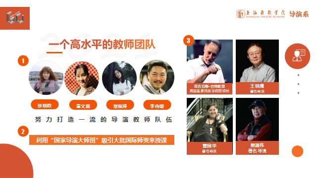 第四,打造一个高水平的开云体育官方下载网站。我们利用系列国际导演大师班集聚的全球几十位知名导演、教授的宝贵资源,来充实我们的教学,同时还积极引进了多位全职教师。如今天在座的张晓欧老师、章文颖老师、常佩婷老师、李传缨老师等,他们都非常优秀。前三位都是博士,传缨老师主演我们原创的《许村故事》获得了“白玉兰”表演奖,他们目前都在一线带班教学。同时,我们今年还完成了海外名师及PD计划,聘请英国皇家戏剧学院前院长巴特教授、上海话剧艺术中心著名导演雷国华老师来导演系任教。