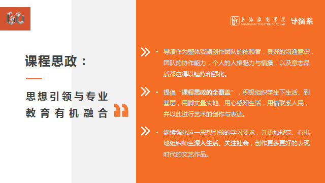 第五,一流课程建设。目前导演系全部专业主课程均为上海市精品课程或一流课程,实现了上海市精品课程的全覆盖,并获得了“上海市教学成果奖一等奖”。接下来“十四五”规划重要的目标就是冲击国家一流课程及思政课程,以及与之相关的教材建设。利用我们丰富的海外名师及各个导演工作室的特色教育,提升课程质量,加强内涵建设。