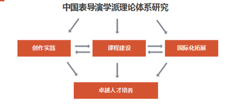 正是因为这样的理念与特色,我们目前正在努力开掘,并将继续为之奋斗的学科建设目标就是:中国表导演学派理论体系研究与建设。这是我们这个学科最重要的目标和任务,确定这样的学科定位以后,我们将在以下三个方面积极开拓,即:课程建设、创作实践与国际化拓展;而这些工作的最终出口就是培养卓越导演艺术人才。这是一个相互依存、相互作用的培养结构,具体如图所示: