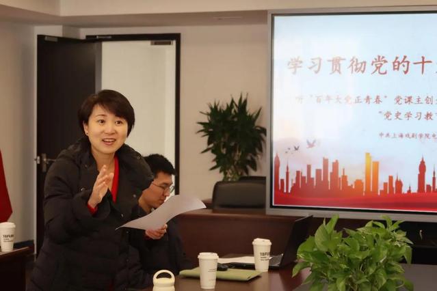 邬佳力同志结合自己现场聆听的切身感受和深入认识,将中共中央政治局常委、中央书记处书记王沪宁同志在十九届六中全会精神宣讲动员会的发言要点,中宣部部长黄坤明同志在中央宣讲团首场报告会上所作报告的要点,为在场党员进行了生动的传达。然后,她分享了上海人民广播电台《百年大党正青春》全媒体党课节目创作的台前幕后,向在座的党员介绍了节目主创们如何通过主题化设置、对象化传播、互动化表达,将受众的党史学习教育引向历史深处和理论高地,展示了当代青年媒体人“学史明理、学史增信、学史崇德、学史力行”的业务实践,以及争做党建思政和业务水平双高典范的追求。邬佳力老师还特别分享了一份“常委的片单”,其中包含了《长津湖》、《觉醒年代》、《扫黑风暴》等多部影视作品,让在场的影视艺术专业师生备受鼓舞,也倍感任重道远。
