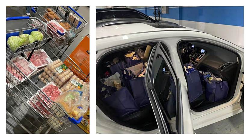 近日的“倒春寒”让上海骤然回到了寒冬,3月22日的气温仍然不到10℃。一大早,佳健老师就驱车前往家附近的超市进行采购,不一会儿就把两辆购物车装得满满当当,肉蛋、蔬菜、面包、调味料,应有尽有。分好袋子、打包完,佳健老师便开着他的“小白”挨家挨户地进行“配送”。因为封闭管理,老师们只能在小区门口短暂地进行交接。导演系有位老师因为封楼无法下楼,佳健老师便贴心地留了张纸条,移交给小区的工作人员代为转交。