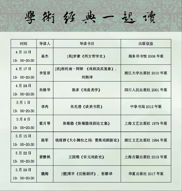 本学期从4月10日至5月29日每个周日晚七点,戏文系历史与理论教研室都会准时推出一期“学术经典一起读”线上读书会。今年春天,上海进入全面抗疫时期,所有的线下教学都转为线上,同学们也都被限制在很小的范围内活动。为了缓解大家的焦虑,让大家在特殊时期不忘学习、不废学习,戏文系推出了“读书、读剧、读世:春天里的戏文系”大型线上主题活动。史论教研室举办的这一系列读书会也是该活动的一个版块,即“三读”之一的“读书”。