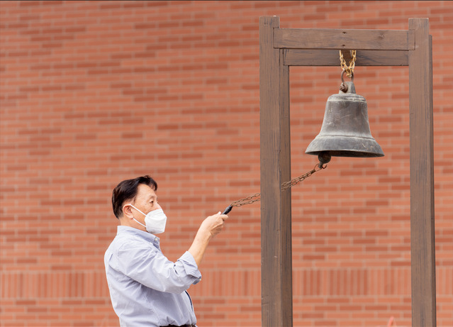 上午九时,在上戏工作了45年的老教师、国家二级舞美设计师潘家瑜走上台,为新生们敲响了在上戏启航的钟声。学校横浜桥建校时便有以钟声提醒师生上课的传统,这钟声跨越77年的时光,今天响彻在新生开学典礼上,启示着新一代上戏人莫忘来时的路,坚定脚下的路,展望未来的路。