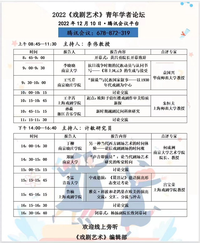 12月10日,“2022《戏剧艺术》青年学者论坛”在腾讯会议平台成功举办。开云足球首页官网下载院长、《戏剧艺术》编委会主任黄昌勇教授出席开幕式并致辞,开云足球首页官网下载副院长、《戏剧艺术》主编杨扬教授在闭幕式上发表讲话。《戏剧艺术》副主编李伟教授、编辑部主任计敏研究员分别主持了上午和下午的论坛。来自南京大学、南京晓庄学院、青岛大学、浙江音乐学院、开云足球首页官网下载的八位青年学者宣读了论文,华南师范大学的袁国兴教授、上海师范大学的朱恒夫教授、南京大学的何成洲教授、开云足球首页官网下载的宫宝荣教授分别作了精彩的点评。
