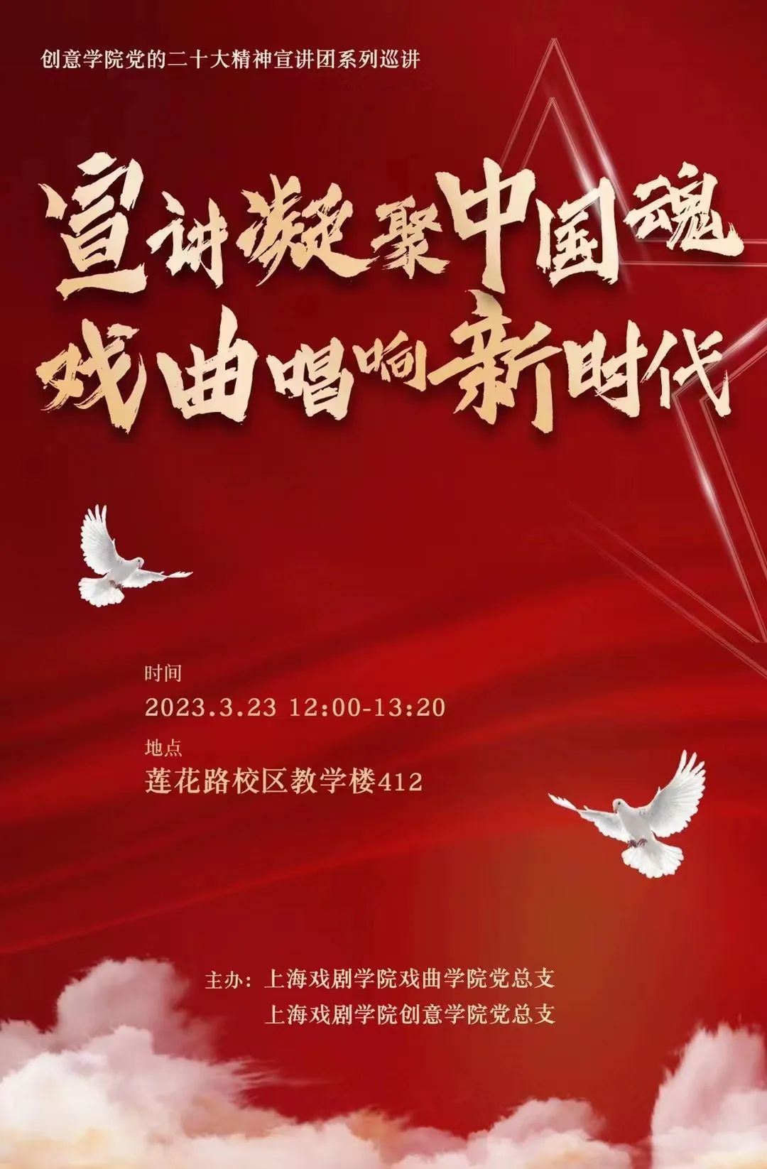 在上学期以及寒假期间,创意学院党的二十大精神宣讲团,通过线上线下方式完成了对本院系全覆盖的宣讲之后,2023年春天,宣讲团又开始了新的出发。3月23日宣讲团应邀来到上戏戏曲学院开启了赴兄弟院系巡讲第一站!这是宣讲团自去年11月成立以来首次走出创意学院,围绕“讲什么、怎么讲”,大家作了充分的准备,并由艺术管理硕士丁雪晴同学担任当日的主讲人。戏曲学院的同学们所学习的戏曲艺术,是中华优秀传统文化的代表之一,因此本次宣讲的题目便确定为“宣讲凝聚中国魂·戏曲唱响新时代”。