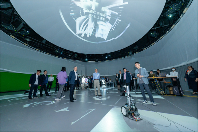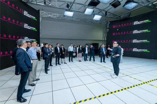两校与会人员首先参观了落户在上戏昌林校区的演艺集成创新文化和旅游部重点实验室、上海市虚拟环境下的文艺创作重点实验室。上戏创意学院副院长铁钟介绍了两校联合研发机器人戏剧《万物之城》的进展情况。大家观看了剧中机器人角色的功能演示,并体验了沉浸式投影环幕及全景LED虚拟拍摄等技术。随后,又在新剧场观摩了科艺融合舞台美术创新教学科研成果展示。
