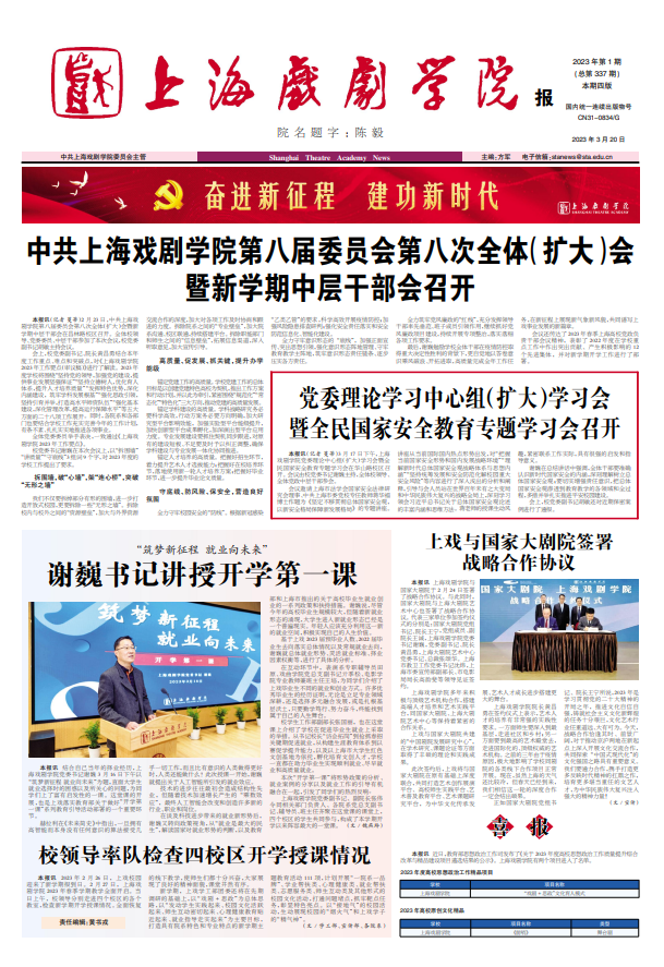 《上海戏剧学院报》2023年第1期(总第337期)已于2023年3月20日出版。重点内容有:《中共上海戏剧学院第八届委员会第八次全体(扩大)会暨新学期中层干部会召开》《党委理论学习中心组(扩大)学习会暨全民国家安全教育专题学习会召开》《“筑梦新征程 就业向未来” 谢巍书记讲授开学第一课》等。敬请关注,也可点击下载阅读。(文、编辑:榕树)