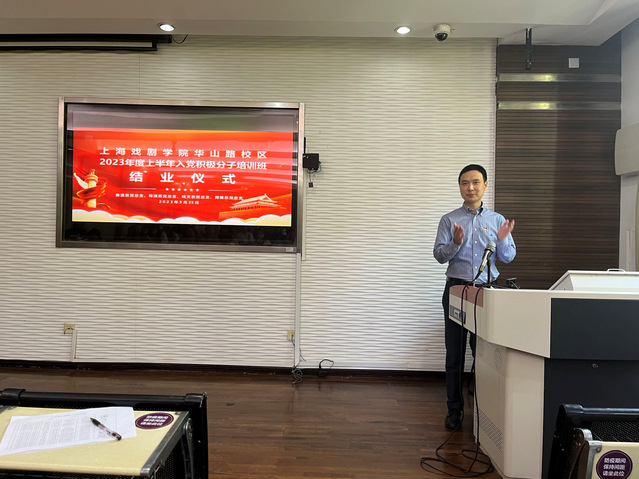 会议仪式在师生们齐唱《中华人民共和国国歌》中拉开序幕。朱锋老师首先总结了本期培训班的情况,表示在学校组织部的关心下,在四个院系精心准备和各位学员的全力配合下,各项课程安排落实到位,培训基本取得了预期目标。同学们进一步学深悟透党的二十大精神,进一步全面了解中国共产党发展历史,进一步明晰共产党员的权利与义务。戏文系党总支副书记陈莹、舞美系党总支副书记孙蕾、导演系党总支副书记石俊共同为培训合格的入党积极分子颁发培训结业证书。
