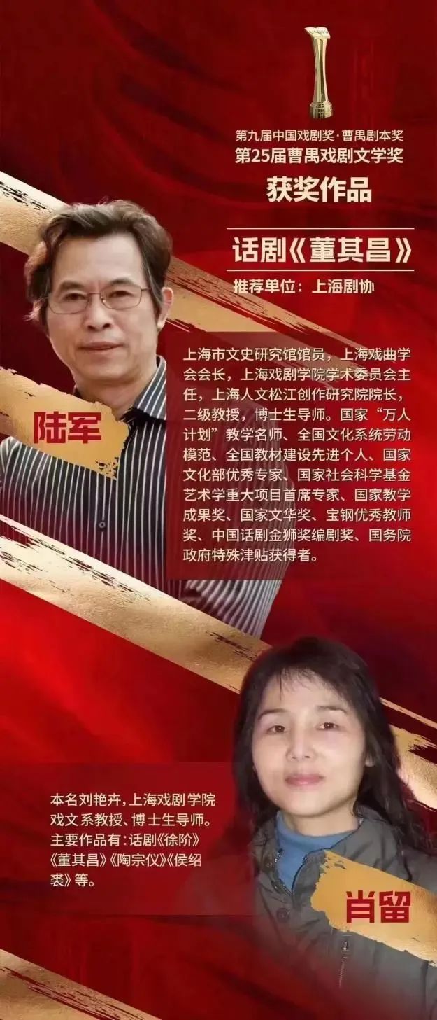 2021年,话剧《董其昌》荣获第35届田汉戏剧奖剧本奖一等奖。本次再获曹禺剧本奖,无疑是对该剧戏剧文学价值的高度肯定。这对于上戏戏剧文学系师生也是极大的激励,全系将以此为动力,坚守艺术追求,提升艺术修为,守护与发扬戏文荣光。(文:戏文系 编辑:榕树)