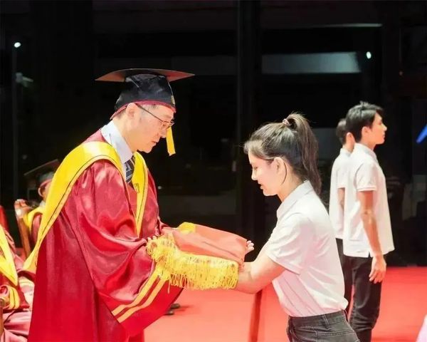 校旗传接仪式将毕业典礼推向高潮。四位毕业生代表与四位在校生代表分别怀揣着激动的心情,迈着整齐的步伐走上台来。当毕业生代表亮旗时,全场热烈欢呼。他们将校旗折叠整齐,郑重地呈交给校党委书记谢巍。谢巍则将校旗传递给在校生代表。在校生代表接过校旗并再度展开,一瞬间全场掌声雷动。校旗传接过程中共响起三次掌声,随着一次比一次热烈的欢呼,现场氛围达到高潮。