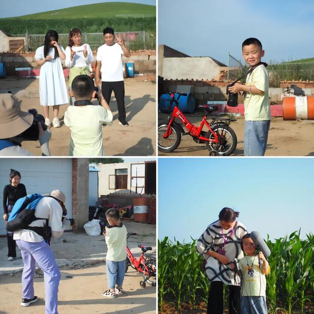 在附近村屯里,我们遇见了幼儿园的学生东东,他看到我们的摄影和录音设备后,产生了极大的兴趣,第一次拿起单反相机的他却有着“职业摄影师”的范儿,立刻给家人拍了一张合影。他还戴上耳机,背上录音杆,走进玉米地里,尝试着录制田野里的环境音。