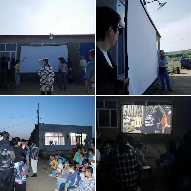 下午,我们在一户牧民家的仓库门前架起200寸幕布和投影设备。露天电影放映的消息一出,不少家住附近村屯的村民们都自发领着家里的孩子来到这里。傍晚时分,仓库前的空地坐满了观众,现场放映了由上戏学生拍摄的《红风筝》等多部短片,苍穹之下,光影之间,我们与影片中的角色一起经历着人生的起伏和波折。在这样的氛围下,彼此之间的距离也变得更加亲近了。