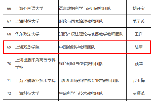 国家教育部日前公布《第三批全国高校黄大年式教师团队创建示范活动入围名单》,我校戏文系陆军教授领衔的中国编剧学教师团队入围。本次“全国高校黄大年式教师团队”共有199所高校入选,我校是全国唯一一所戏剧影视类高校。