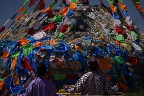 下午从取景地驱车出发到当地的巴日松贵敖包。两匹马在敖包下的石头地被演员们牵引着,待登上敖包时,我们被雄伟的敖包景吸引。在傲视苍穹的石堆、飞扬的经幡前演员父子俩虔诚地祭拜,也保佑此次活动顺利进行。