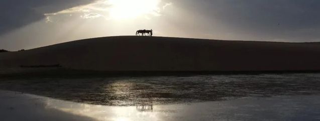 下午到蒙古包附近的沙坡上由无人机航拍演员兄弟俩牵马一路向东走去的场景。日落时分,无人机逆光拍摄;迎着彩霞,《恒干》组结束了为期四天的拍摄。