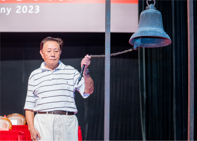 上午九时,在上戏工作了46年的老教师、国家二级舞美设计师潘家瑜走上台,为新生们敲响了在上戏启航的钟声。这钟声彷佛从上戏建校初期的横浜桥跨越78年的岁月,响彻在2023级学生开学典礼上,启示着新时代的上戏人莫忘来时路,走好脚下路,坚定未来路。
