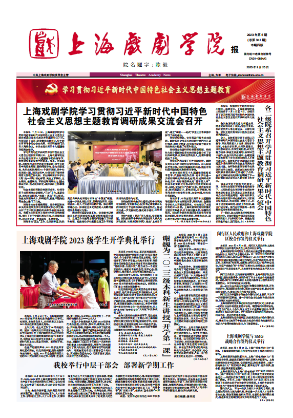 《上海戏剧学院报》2023年第5期(总第341期)已于2023年9月20日出版。重点内容有:《上海戏剧学院学习贯彻习近平新时代中国特色社会主义思想主题教育调研成果交流会召开》《各二级院系召开学习贯彻习近平新时代中国特色社会主义思想主题教育调研成果交流会》《上海戏剧学院2023级学生开学典礼举行》等。敬请关注,也可点击下载阅读。(文、编辑:榕树)