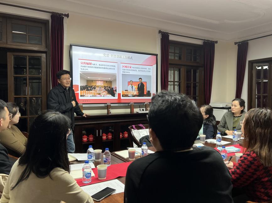 黄荣书记介绍了上海交通大学公共卫生学院以党建引领学科发展的相关情况,特别是其卓有成效的“党建+科普”的建设特色与工作成效,使上戏创意学院党总支深受启发。