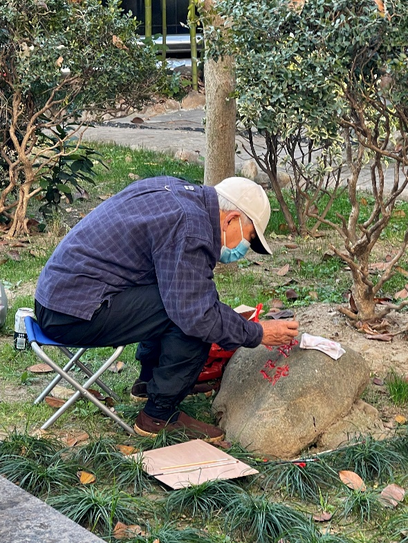 2023年12月5日下午,在综合楼前的草坪上,一位耄耋老人自备工具、座椅,正专注地在为地上的一块石刻《蕴翠吐紫》描着红……