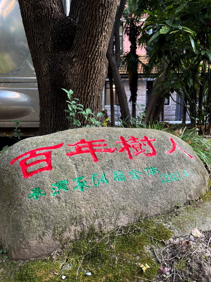 我即与德先、糜曾两位师兄一起在校园寻觅近十年来学院多次装修改造施工后的剩余闲置大块石材,请我院餐厅几位身强力壮的师傅和我一起拉、扛、抬、搬移至香樟树下到位。又购置了20厘米长的尖头、扁平头钢凿各一把,用了将近一周的时间完成凿刻。全班师兄弟姐妹委托在校工作的德先、糜曾师兄和我时时照应关心这棵樟树。这棵樟树也承载着大家对母校的寄托和感谢茁壮成长着,如今它的最高树梢已平齐红楼第三层顶板(约12米高)。每年回上海一次我都要将这两块石刻漆描一次。