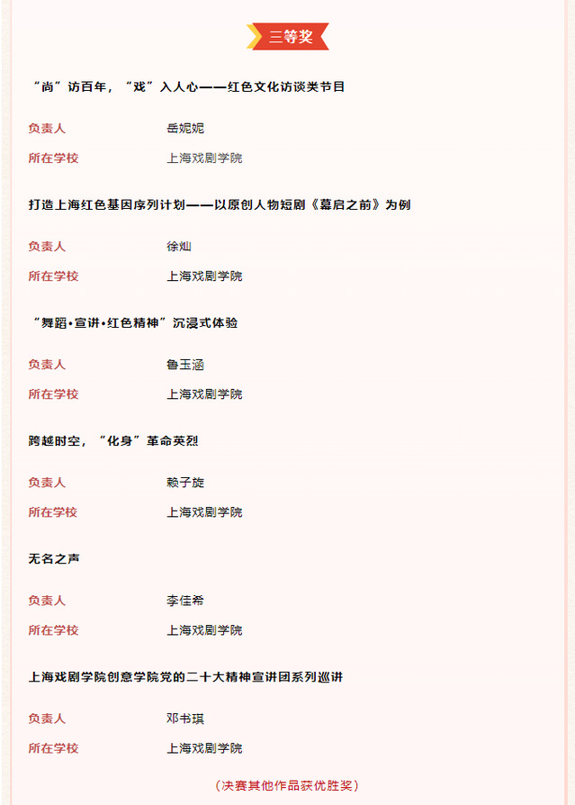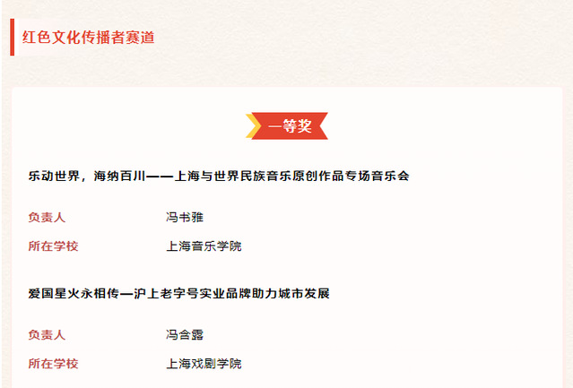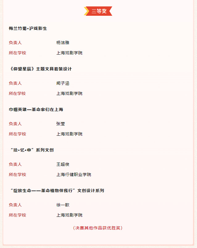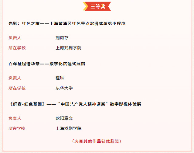 本次大赛的成功举办,为青年学子搭建了一个创新实践的舞台,相信这些富有创造力和感染力的作品和项目,将为红色文化的传播注入新动能,助力上海“党的诞生地”红色文化传承弘扬工程,推动上海市大学生红色文创基地建设更上一个台阶,激励更多青年学子以实际行动传承红色基因、赓续红色血脉,肩负起青年的使命与担当。