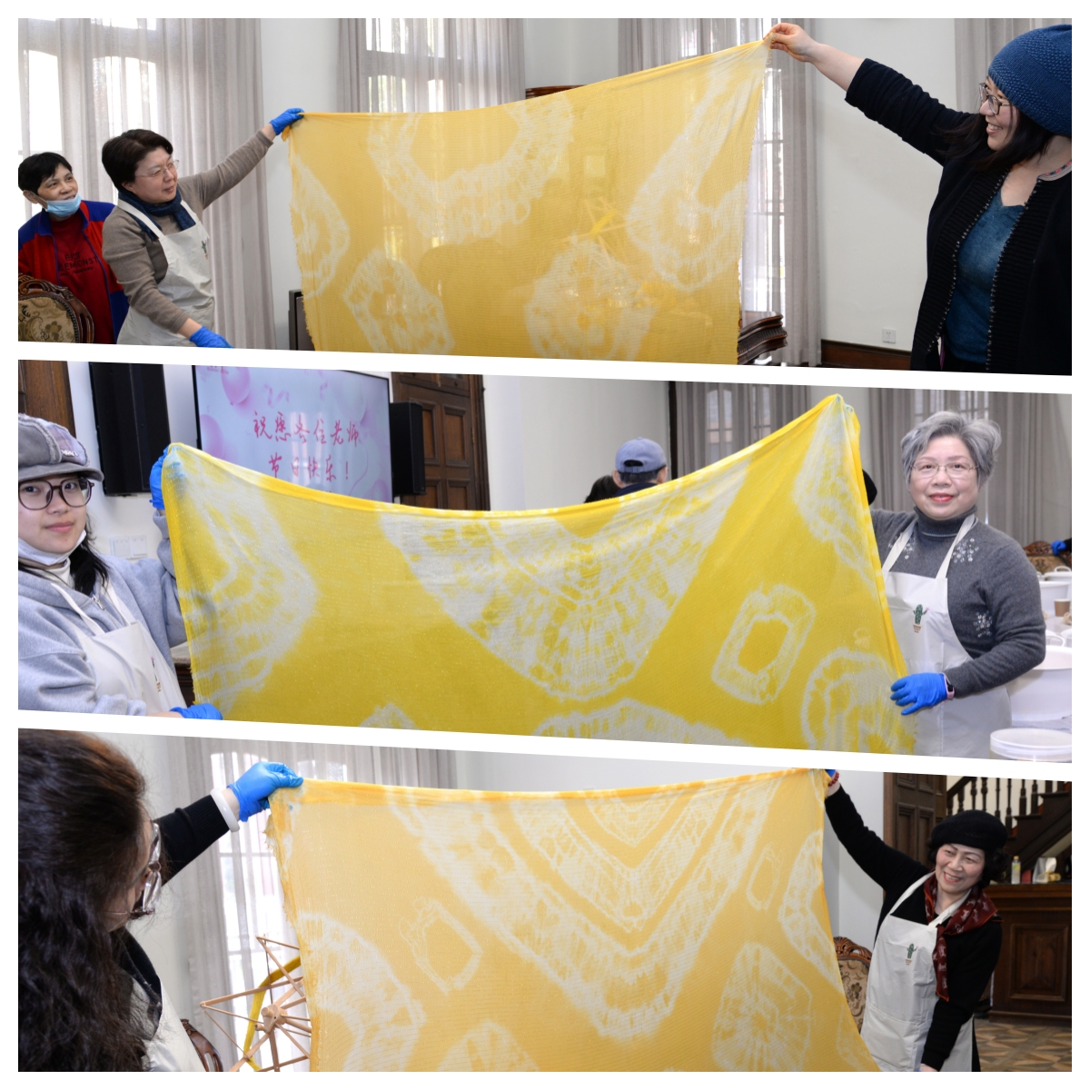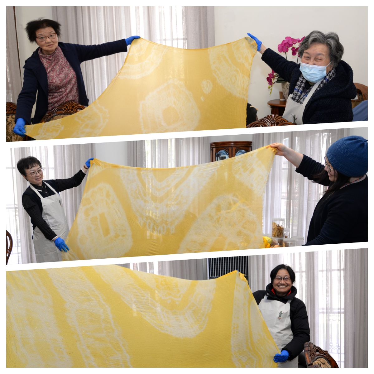 观摩了邵老师的演示后,老同志们兴致勃勃穿上围裙,戴上手套开始扎染“实战”操作。大家先发挥创意对围巾图案进行构思,根据各自的构思将围巾打结,有的老师从围巾中央开始打结,有的从四周开始;有的打结密度高,有的密度低;有的打结呈对称分布,有的则单侧布局,不同的打结方式经染色后就会呈现不同的图案。然后,大家将打好结的围巾放入染料中染色,静置20分钟后取出进行清洗。打开染色过的围巾,看到自己成果的那一刻最激动人心。一幅幅金黄色的美妙图案给大家带来一次又一次惊喜,女教职工们互相比较,互相赞美,每个人脸上都露出了灿烂的笑容,整个活动现场洋溢着欢乐的笑声。活动结束后,女教工们纷纷感谢离退休工作处并表示今后会继续踊跃参加活动。