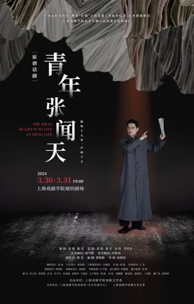 三月末,由上海戏剧学院戏剧文学系制作出品,表演系(含音乐剧中心)、舞台美术系联合支持的原创话剧《青年张闻天》,于端钧剧场上演。