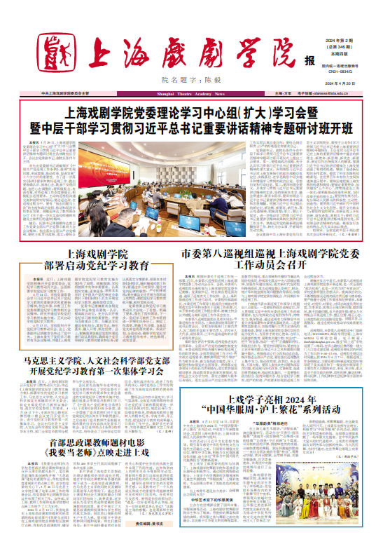 《上海戏剧学院报》2024年第2期(总第346期)已于2024年4月20日出版。重点内容有:《上海戏剧学院党委理论学习中心组(扩大)学习会暨中层干部学习贯彻习近平总书记重要讲话精神专题研讨班开班》《上海戏剧学院部署启动党纪学习教育》《市委第八巡视组巡视上海戏剧学院党委工作动员会召开》等。敬请关注,也可点击下载阅读。(文、编辑:榕树)