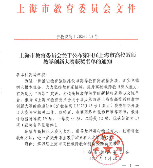 近日,上海市教育委员会公布了第四届上海市高校教师教学创新大赛名单。