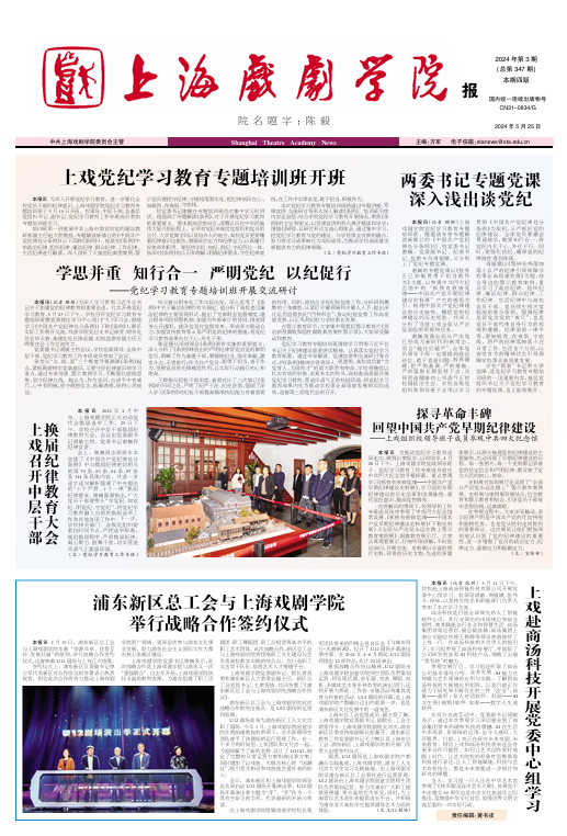 《上海戏剧学院报》2024年第3期(总第347期)已于2024年5月25日出版。重点内容有:《上戏党纪学习教育专题培训班开班》《学思并重 知行合一 严明党纪 以纪促行——党纪学习教育专题培训班开展交流研讨》《两委书记专题党课 深入浅出谈党纪》等。敬请关注,也可点击下载阅读。(文、编辑:榕树)
