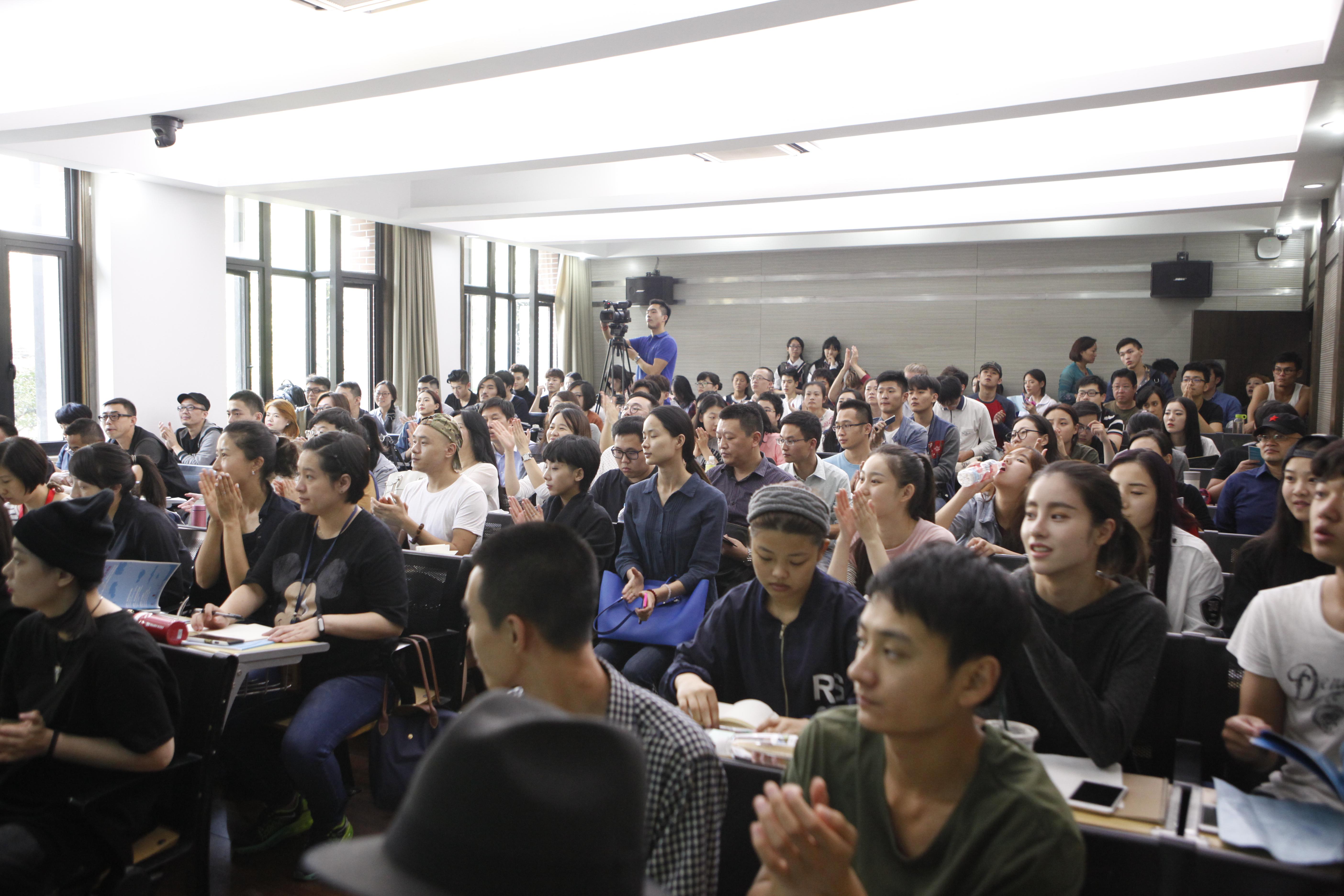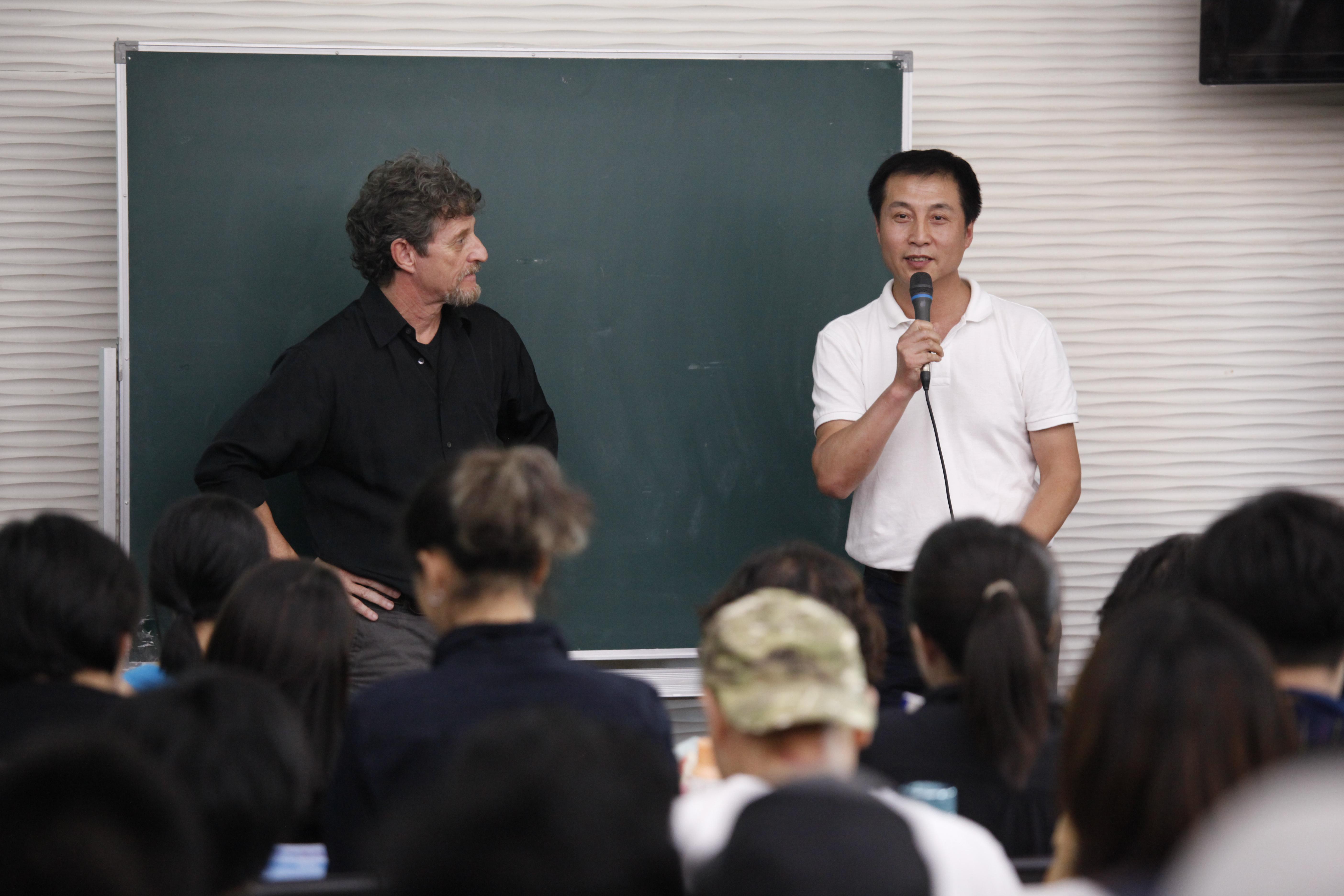 讲座开始前半小时,209教室便已坐满了来自校内校外慕名而来的观众,讲座正式开始时整个教室连过道都坐满了人。讲座一开始,莱纳德·佩蒂特教授首先向大家生动的讲述了迈克尔·契诃夫的生平,接下来莱纳德重点阐述了迈克尔·契诃夫“ 梦幻现实主义”戏剧观;创造性想象力、“双重意识”学说、“气氛”学说、形体动作“四兄弟”、“心理姿势”学说,以及迈克尔·契诃夫方法在教学中的五个指导原则 。莱纳德用简洁又不失诙谐的语言深入浅出地向大家阐述了迈克尔·契诃夫方法的核心。莱纳德表示:他与他的团队更多的是在开发和拓展迈克尔·契诃夫方法并将其分享出去。他说他非常荣幸能够来到上海戏剧学院,并希望更多的人能受益于迈克尔·契诃夫方法。在讲座的最后,上海戏剧学院表演系党支部书记、表演系教学副系主任、国际表演实验教学工作室主持何雁老师幽默地用一位大师班学员的学习心得来表达迈克尔·契诃夫方法的成效:“真的感觉像是来到了魔法学校,我们都是学魔法的人,这几天不断发生神奇的事情,我感到身体里沉睡多年的细胞被唤醒……”在观众热烈的掌声中,讲座圆满结束。