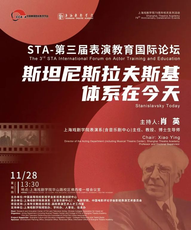 在全球表演艺术教育交流互鉴共融的背景下,表演教育领域迎来了一场聚焦经典与创新的国际盛会。2024年11月28日,由中国高等院校影视学会影视表演创研中心主办、上海戏剧学院表演系、电影学院、中国电影评论协会影视表演艺术委员会共同承办的“STA-第三届表演教育国际论坛”,在上海戏剧学院历史悠久的佛西楼一楼会议室盛大启幕。本次论坛由构建中国戏剧影视自主话语体系-斯坦尼斯拉夫斯基表演体系教学国际论坛项目和文教结合工作室项目-高校表演艺术人才工作室提供经费支持。