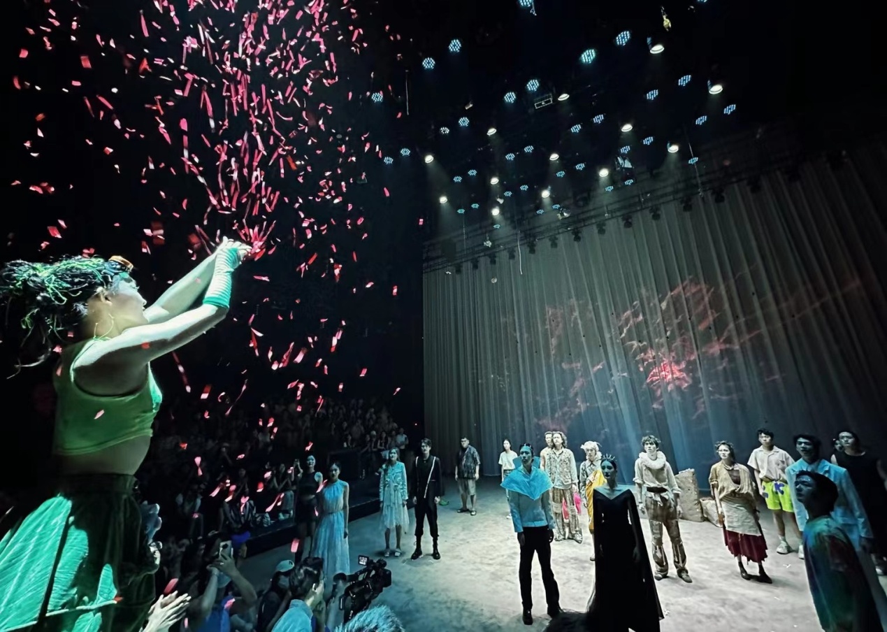 与此同时,上个学期表20的同学们已经专门学习了莎剧,于是本学期老师们选择了莎士比亚的《仲夏夜之梦》作为实习大戏。虽然这部戏对同学们来说并不陌生,但也极具挑战。在排演过程中,同学们采用了工作坊的形式,集思广益并且极具创造性地将戏中戏部分改成了《罗密欧与朱丽叶》的故事,还加入了戏剧大赛作品的模仿与脱口秀模仿训练,从中学习和训练喜剧表演的节奏,具有很强的观赏性。最终的呈现不仅融入了舞蹈、乐器、魔术、说唱、舞台技巧等多种形式,还摈弃了传统镜框式舞台,采用三面围坐的伸出式舞台,增强了与观众的互动感。舞台上的各种技术给此次演出注入了新鲜的养分,提升了学生们的创作观念和实践能力。这部实习大戏在一定程度上从舞台形式、观演关系、演员创作的角度致敬了莎士比亚时代的戏剧艺术,让莎翁的这部经典作品焕发出强烈的当代意义。