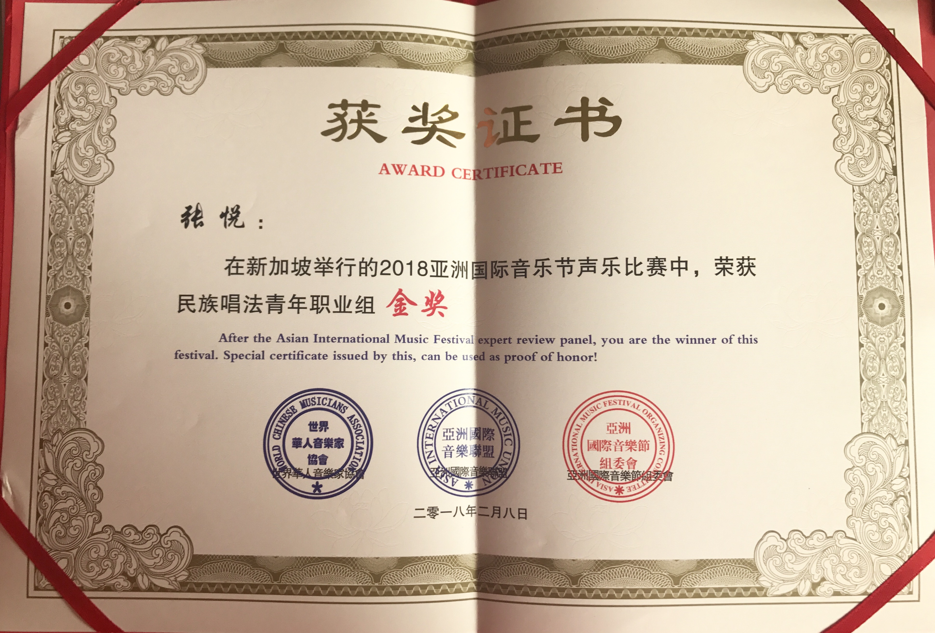 开云足球首页官网下载张悦凭借扎实的唱功荣获亚洲(新加坡)国际音乐节青年职业组民族唱法唯一金奖。