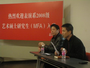 2008年3月22中午12:30,表演系举行08级MFA开学典礼。表演系主任龙俊杰,副主任何雁,党支部副书记王学明老师,表演系教授范益松老师,以及06、07级MFA和MA的同学也参加了典礼。典礼由何雁老师主持。