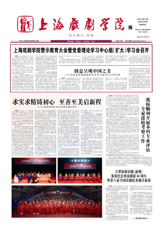 《上海戏剧学院报》2024年第4期(总第348期)已于2024年6月25日出版。重点内容有:《上海戏剧学院警示教育大会暨党委理论学习中心组(扩大)学习会召开》《创意呈现中国之美——上戏召开党委理论学习中心组(扩大)学习会》《求实求精铸初心 至善至美启新程——上海戏剧学院2024届毕业典礼举行》等。敬请关注,也可点击下载阅读。(文、编辑:榕树)