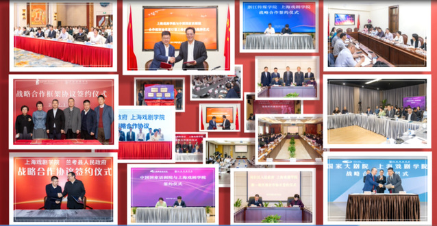 在学校持续释放的影响力的作用下,各级政府、院团、企事业单位同上戏签约不断,在人才培养、科研创作、剧院管理等领域开展广泛交流合作,形成一系列有高度、有亮点、有特色的社会服务品牌。通过与国家大剧院、北京人民艺术剧院、中国国家话剧院、上海大剧院艺术中心、上海广播电视台(文广集团)等单位的合作,文教结合、科艺融合、产教融通等一系列实践更具有了坚实的支撑。