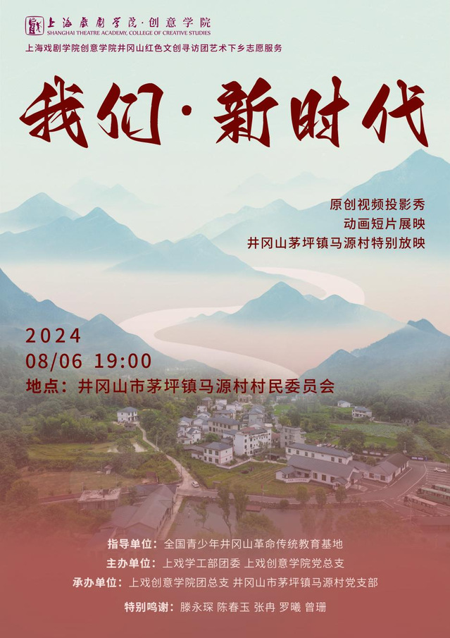 茅坪镇马源村,是毛泽东同志当年进入井冈山的第一站。在这个有特殊意义的地方,上戏创意学院师生开展了一场特别的放映。放映的内容是创意学院的投影作品《我们·新时代》,创意学院动画专业学生的一批原创动画,也借此机会展现在革命老区的父老乡亲面前。