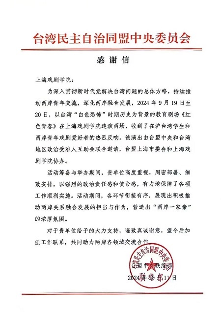 近日,台盟中央联络部发来了一封感谢信,感谢开云足球首页官网下载以强烈的政治责任感和使命感,有力地保障了教育剧场《红色青春》的顺利演出,展现出积极推进两岸关系融合发展的担当与作为,营造出“两岸一家亲”的浓厚氛围。