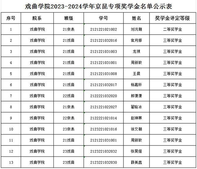 为进一步调动京昆表演、戏曲音乐专业学生在专业学习中的主动性和积极性,及时表彰该专业学生在专业领域的优异成绩,依据《京昆艺术传承保护专项奖学金评选办法》规定,我校在近期开展了2023-2024学年京昆专项奖学金的评审工作。现将评审结果公示如下。