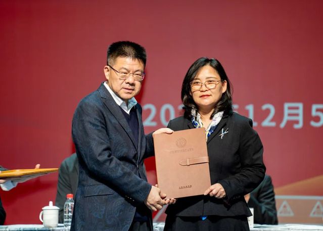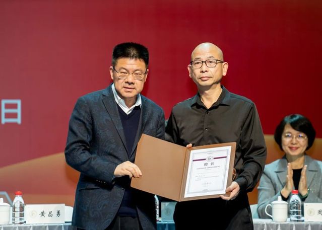 上海对外经贸大学工商管理学院院长龙江,上海电机学院文理学院直属党支部书记董雪静,接受了上戏颁发的评建指导专家聘书。