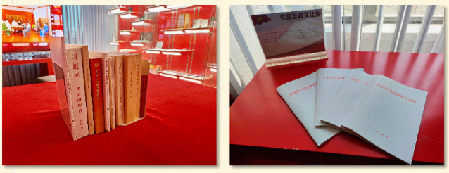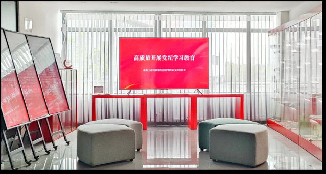 近年来,党支部在上戏昌林路校区持续建设“党建思政文创角”,以沉浸式理念向师生宣传习近平新时代中国特色社会主义思想,其功能不断丰富和完善。阅读区常年设有《共产党宣言》等马克思主义经典著作。同时,根据学习贯彻党的二十大精神,开展学习贯彻习近平新时代中国特色社会主义思想主题教育、党纪学习教育等要求,不断充实《中国共产党章程》《习近平著作选读》《中国共产党纪律处分条例》等资料。党建思政文创角内的屏幕矩阵,结合党的二十大,结合学习贯彻习近平新时代中国特色社会主义思想主题教育,结合党纪学习教育等重大主题,滚动式传播相关内容。